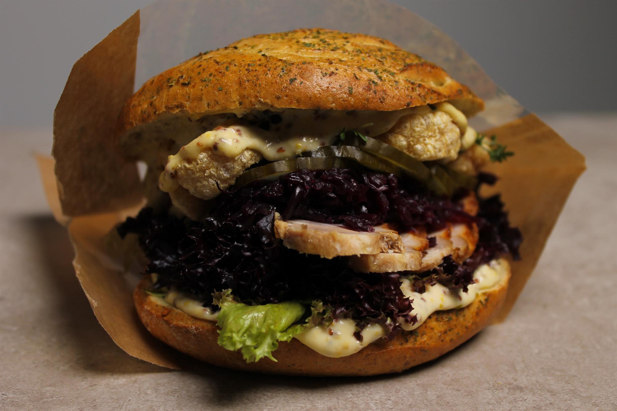 MM bolle med krydderurter Sennepscreme Crisp salat TP kam i skiver Rødkål og hj.syltede agurker Flæskesvær Krydderurtesalat
