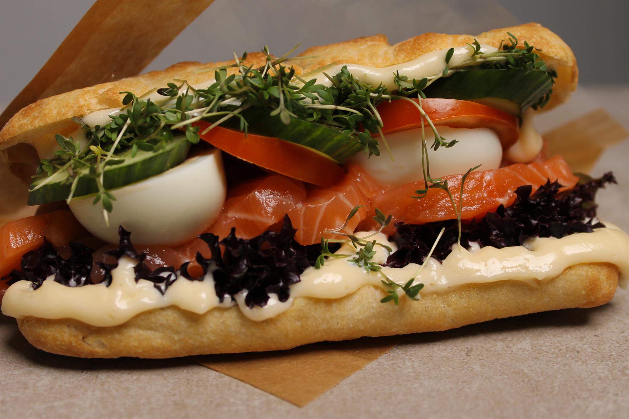 MM Focaccia Mayo Crisp salat Koldrøget laks i skiver Kogt æg Agurk og tomat i skiver Krydderurtesalat
